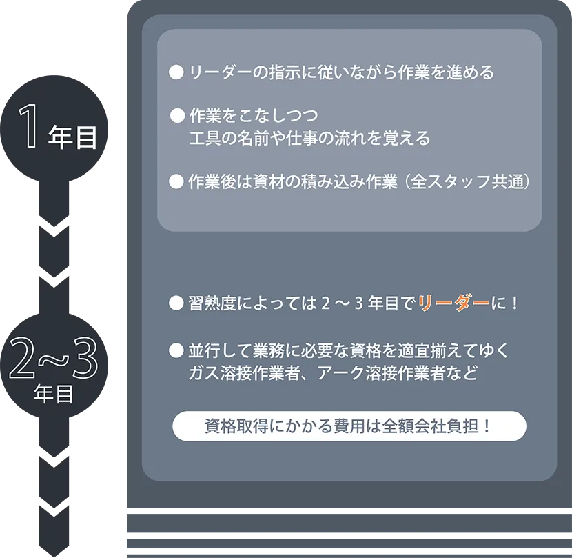 経験や資格がなくても、やる気さえあれば私たちがしっかりサポートします。未経験からでも、一歩ずつ着実に成長できる環境がここに。ゼロから溶接工事・プラント工事のプロを目指したい方、大歓迎です!